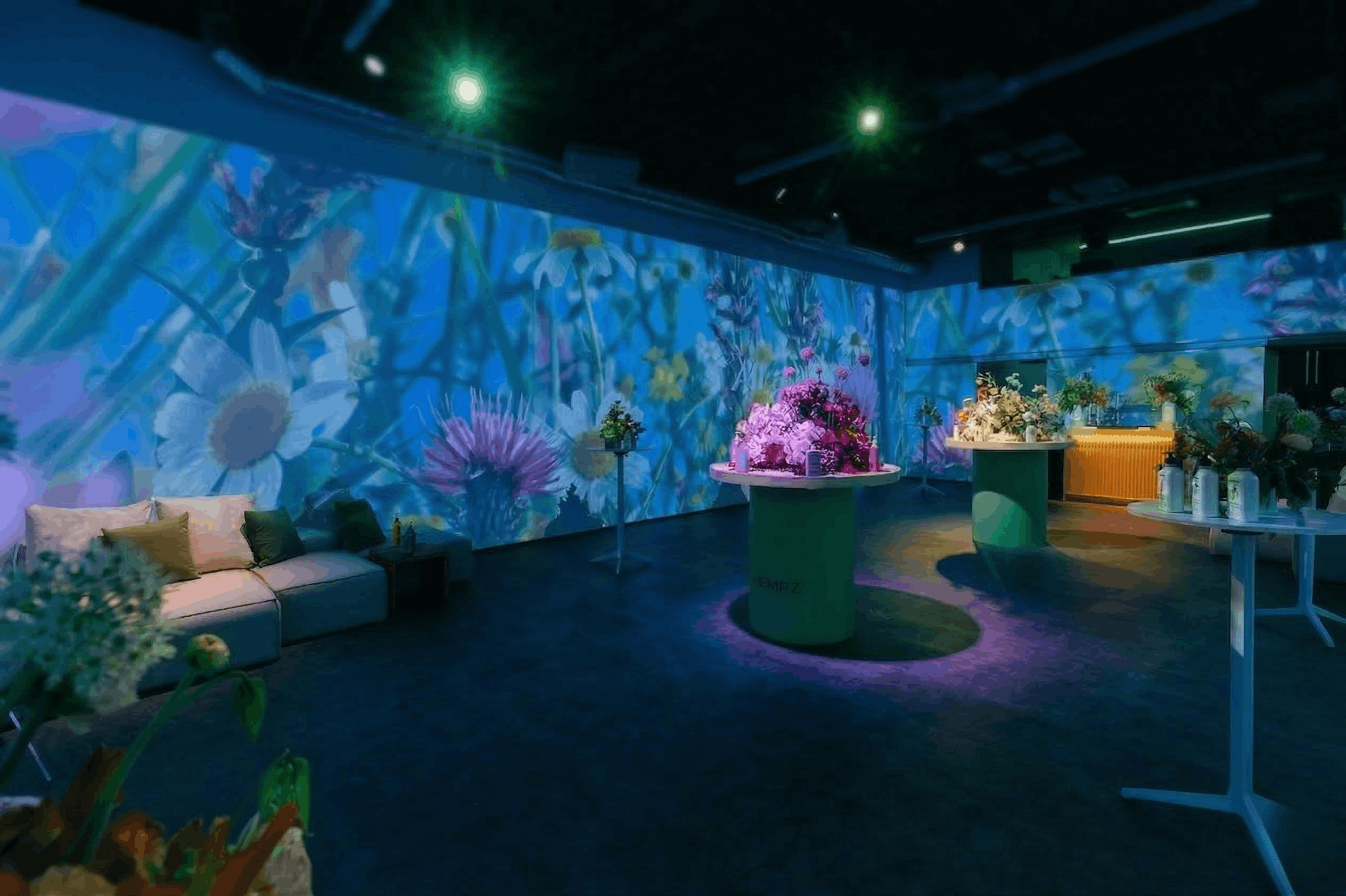 The main box provides 360-degree projection technology to create a completely immersive and digitally customizable environment. There are three bathrooms in the main box and a hallway vanity and sink. The lobby provides a coat-check option and a space for gift bags, buffet stations, and indoor vinyl. There is an array of different layout options to choose from in the main box. It holds 140 seated and 200 standing guests.